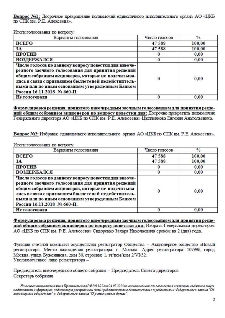 ОТЧЕТ ОБ ИТОГАХ ГОЛОСОВАНИЯ НА ВНЕОЧЕРЕДНОМ ЗАОЧНОМ ГОЛОСОВАНИИ ДЛЯ ПРИНЯТИЯ РЕШЕНИЙ ОБЩИМ СОБРАНИЕМ АКЦИОНЕРОВ Акционерного общества "Центральное конструкторское бюро по судам на подводных крыльях имени Р.Е. Алексеева" (АО «ЦКБ по СПК им. Р.Е. Алексеева»)